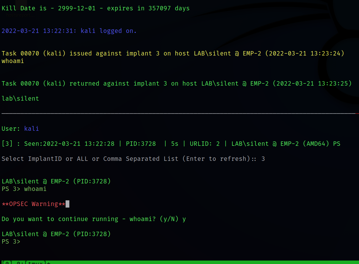 A red teamer can issue the bellow command when he has connected to an implant